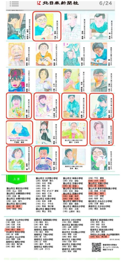 小学生図画コンクールは、ご家族の日常の一場面を観察して描くコンクールです。当教室からは19名が上位入賞いたしました。力作ぞろいの作品をぜひご覧ください。また下に新聞紙面と巡回展示スケジュールを掲載いたしました。